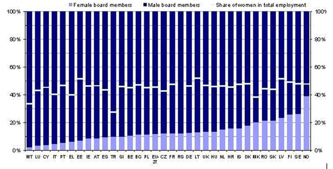 Conform noului raport privind echilibrul dintre femei și bărbați în structurile de conducere ale companiilor, în medie femeile reprezintă 12% din numărul membrilor consiliilor de administrație ale celor mai mari societăți cotate la bursă din întreaga UE și numai 3% din numărul președinților consiliilor de administrație (a se vedea anexa). Cifrele variază de la o țară la alta, în Suedia și Finlanda femeile reprezentând 26% din numărul membrilor consiliilor de administrație, în timp ce în Malta doar 2%.