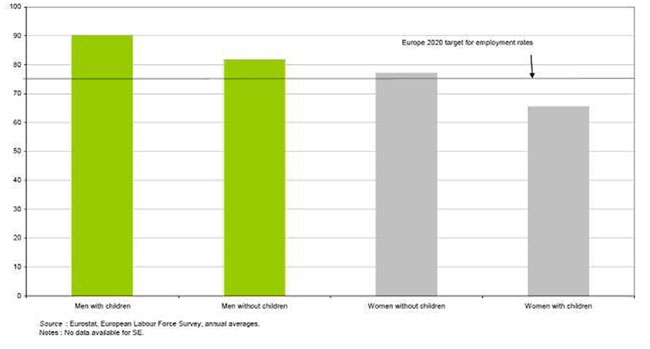 Lăsând deoparte piața muncii, femeile continuă să se ocupe de cea mai mare parte a sarcinilor de îngrijire. Participarea pe piața muncii a mamelor este cu 11,5 puncte procentuale mai mică decât în cazul femeilor fără copii, în timp ce rata de încadrare în muncă a taților este cu 8,5 puncte procentuale mai mare decât cea a bărbaților fără copii. Provocarea pe care o reprezintă capacitatea de a reconcilia viața profesională, familială și privată este una dintre numeroasele cauze ale diferenței de salarizare dintre femei și bărbați: femeile din UE câștigă în medie cu 17,5% mai puțin decât bărbații, neînregistrându-se vreo diminuare a diferenței de salarizare a femeilor și bărbaților în ultimii ani.