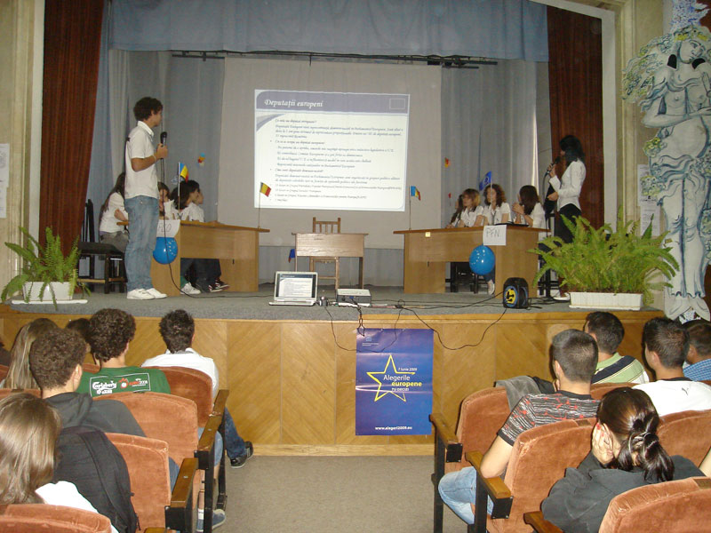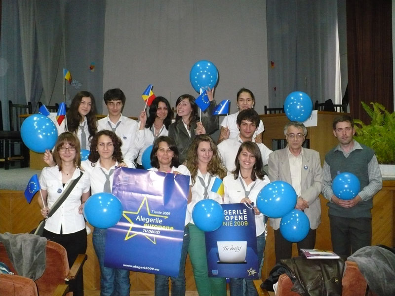 Astfel, una dintre actiunile desfasurate de elevi a fost confectionarea si distribuirea de pliante informative, atat despre aceste notiuni elementare, cuprinzand si detalii despre activitatea principala din cadrul proiectului Euroscola . De asemenea, elevii au creat si un afis sugestiv sub sloganul « Viitorul Europei e in mainile tale » prin care invitau cetatenii orasului la activitatea din 2 iunie.