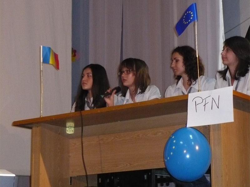Ultima parte a evenimentului organizat de elevi a constat intr-o dezbatere intre 2 partide fictive, liceenii imaginandu-si ca se afla in campanie electorala si ca vor sa devina euro-parlamentari. Cele 2 partide erau : PCO (Partidul Cetatenilor Obisnuiti) si PFN (Partidul Fara Nume). Prima problema dezbatuta a fost modalitatea de sacrificare a porcinelor, stiindu-se ca Uniunea Europeana este impotriva injunghierii si propune asomarea animalelor, insa taranii romani nu renunta la vechiile traditii. Argumentele pro injunghiere au fost: pastrarea identitatii nationale, necesitatea unor aparaturi costisitoare si a unor medici veterinari specializati in acest domeniu, cat si faptul ca Romania are probleme mai importante de rezolvat decat cea a porcinelor, iar in ceea ce priveste ideile ce sustin demersul Uniunii Europene sunt: igiena spatiilor de sacrificare a porcilor, necesitatea alinierii in randul celorlalte state europene si bineinteles, inlaturarea suferintei bietelor animale.