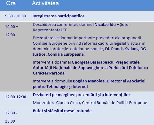 Reprezentanţa Comisiei Europene în România are plăcerea să vă invite la masa rotundă intitulată ”Perspectivele și implicațiile revizuirii legislației UE referitoare la protecția datelor personale”, organizată vineri, 20 aprilie 2012, la Casa Uniunii Europene(str. Vasile Lascăr, nr. 31, etajul 1), începând cu orele 10:00. Potrivit unui sondaj privind atitudinile cetăţenilor cu privire la protecţia datelor în UE, peste 60% sunt îngrijorați în privința modului în care întreprinderile le utilizează datele personale fără a le cere acordul, iar 90% se exprimă în favoarea aplicării acelorași drepturi privind protecția datelor în întreaga Uniune Europeană.