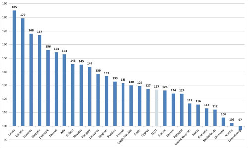 Figura 4: Diferențe între sexe în ceea ce privește nivelul de absolvire a învățământului superior, băieți = 100, 2012
