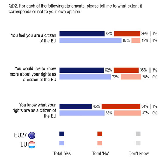 Cetățenii din întreaga UE își exercită drepturile în fiecare zi, fără a fi însă întotdeauna pe deplin conștienți de acestea. De exemplu, aproximativ 37 % din luxemburghezi (și 54 % din europeni) sunt în continuare de părere că nu sunt informați suficient cu privire la drepturile lor în calitate de cetățeni ai UE.