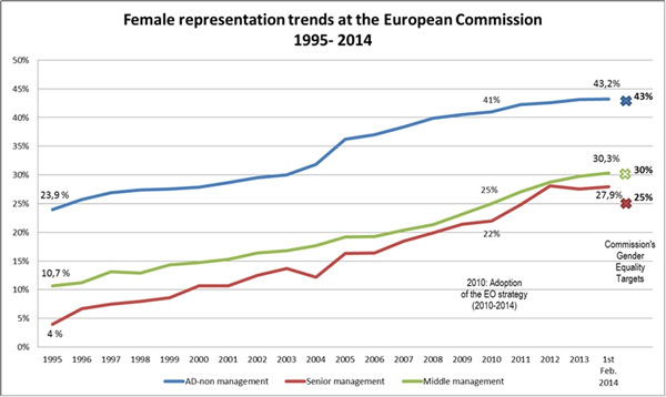 Comisia s-a implicat în mod activ în îmbunătățirea echilibrului său intern între femei și bărbați începând cu 1988. Strategia actuală, care a fost adoptată în 2010, în primul an al actualei Comisii, se bazează pe realizările anterioare, demonstrând în același timp o ambiție reînnoită. Experiența trecută a arătat că, pentru ca obiectivele să fie eficace, o astfel de abordare trebuia completată cu măsuri legate de locul de muncă. Recenta revizuire a Statutului funcționarilor, care a intrat în vigoare la 1 ianuarie 2014, a introdus o trimitere expresă la programele de lucru flexibile. În prezent, aproape 10% din personalul Comisiei lucrează la distanță, iar aproximativ 40% din personal dispune de un token care le permite să lucreze de oriunde, oricând. Dovezile au arătat că, în special pentru femei, flexibilitatea a fost un factor-cheie care le-a încurajat să își asume responsabilități mai mari. Strategia actuală recunoaște, de asemenea, că angajamentul din partea personalului de conducere de nivel superior este esențial pentru obținerea succesului. Prin urmare, Comisia pune în aplicare condițiile pentru asumarea într-o mai mare măsură a rolului de lider și o mai mare responsabilitate din partea personalului său de conducere de nivel superior. Fiecare direcție generală și serviciu trebuie să își prezinte realizările în raport cu un cadru comun de performanță. Performanțele lor sunt evaluate pe baza calculului unui indice al egalității de șanse. În acest context, nouă direcții generale, care au depus cele mai mari eforturi în ceea ce privește egalitatea de șanse, au primit primele etichete privind un loc de muncă egalitar (Balanced Workplace Labels). Direcția Generală Resurse Umane și Securitate efectuează, de asemenea, o monitorizare trimestrială a obiectivelor legate de reprezentarea femeilor în raport cu bărbații la nivelul direcțiilor generale. Context