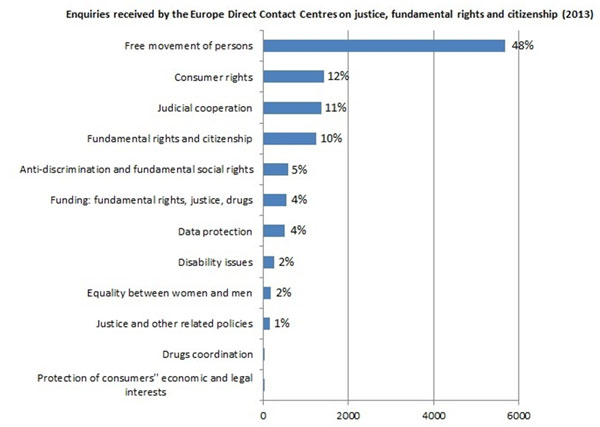 Raportul relevă, de asemenea, faptul că aspectele legate de drepturile fundamentale suscită un interes deosebit în rândul cetățenilor: în 2013, chestiunile ridicate cel mai des de către cetățeni în corespondența lor cu centrele de contact Europe Direct au fost libera circulație și reședința (48% din numărul total de întrebări), aspecte legate de drepturile consumatorului (12%), cooperare judiciară (11%), problemele legate de cetățenie (10%), combaterea discriminării și drepturile sociale (5%) și protecția datelor (4%) (a se vedea anexa 1).