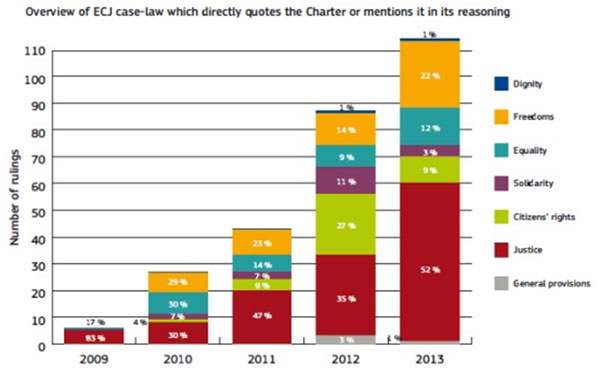 Instanțele Uniunii Europene au făcut din ce în ce mai des trimiteri la cartă în hotărârile lor și au clarificat și mai mult aplicabilitatea acesteia. Numărul hotărârilor instanțelor UE (Curtea de Justiție, Tribunalul și Tribunalul Funcției Publice) care citează din cartă în motivarea hotărârilor lor a crescut de la 43 în 2011 la 87 în 2012. În 2013, 114 de hotărâri au citat dispoziții ale Cartei UE, un număr de aproape trei ori mai mare decât numărul hotărârilor pronunțate în 2011 (a se vedea anexa 2).