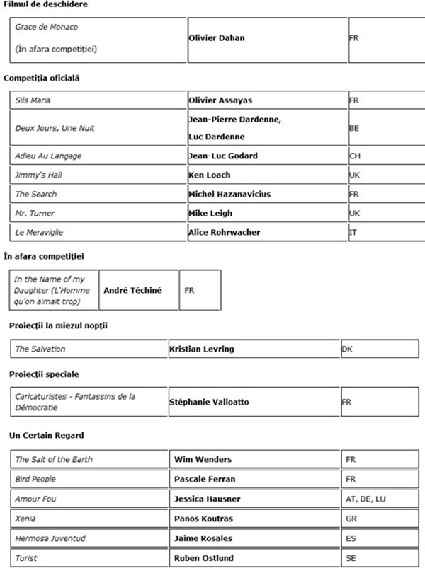 Printre filmele selecționate sprijinite de MEDIA se numără filmul ales pentru a deschide festivalul,Grace de Monaco, cu Nicole Kidman în rolul eroinei de la Hollywood care s-a căsătorit cu un prinț. Celelalte (a se vedea în continuare lista completă) sunt producții noi ale unor regizori europeni celebri, precum Michel Hazanavicius (câștigătorul a cinci premii Oscar în 2012 pentruThe Artist), Mike Leigh (câștigătorul premiului Palme d'Or în 1996 pentru Secrets & Lies), Ken Loach (câștigătorul premiului Palme d'Or în 2006 pentru The Wind That Shakes The Barley), legendarul Jean-Luc Godard și belgienii Jean-Pierre și Luc Dardenne (câștigătorii premiului Palme d'Or în 1999 pentru Rosetta și ai marelui premiu în 2011 pentru Le Gamin au Vélo). Wim Wenders (câștigătorul din 1984 al premiului Palme d’Or pentru Paris, Texas) este reprezentat la secțiunea „Un Certain Regard”.