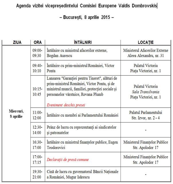 Vicepreședintele Dombrovskis se va întâlni cu prim-ministrul României, Victor Ponta, cu ministrul afacerilor externe, Bogdan Aurescu, cu ministrul finanțelor publice, Eugen Teodorovici, și va participa la evenimentul de lansare a "Garanției pentru Tineret", alături de ministrul muncii și protecției sociale, Rovana Plumb. De asemenea, dl Dombrovskis va participa la un prânz de lucru alături de reprezentanți ai sindicatelor și patronatelor, precum și la o întâlnire cu membri ai Parlamentului României.