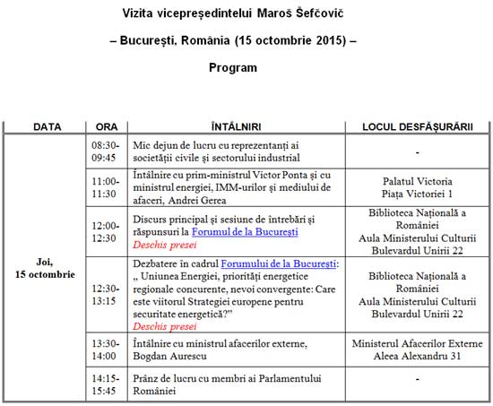 Vicepreședintele Šefčovič va participa, de asemenea, la Forumul 2015 de la București, în cadrul secțiunii cu tema „Uniunea Energiei, priorități energetice regionale concurente, nevoi convergente: Care este viitorul Strategiei europene pentru securitate energetică?” (deschis presei).
