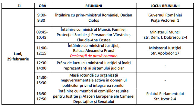 De asemenea, comisarul Věra Jourová va participa la o masă rotundă cu organizații neguvernamentale active în domeniul politicilor privind integrarea romilor pentru a discuta experiența României în ce privește implementarea strategiei naționale de integrare a romilor.