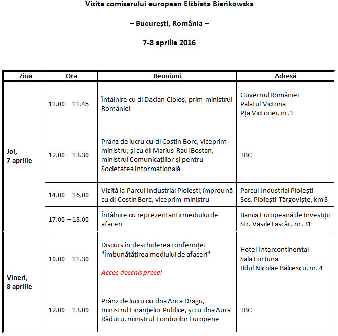 Comisarul european pentru piața internă, industrie, antreprenoriat și IMM-uri Elżbieta Bieńkowska va efectua o vizită oficială în România, în perioada 7-8 aprilie 2016.