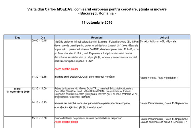 Dl Moedas se va întâlni cu dl. Dacian CIOLOȘ, prim-ministrul României, cu dl. Mircea DUMITRU, ministrul Educației Naționale și Cercetării Științifice, cu dl. Mihai Robert DIMA, președintele Autorității Naţionale pentru Cercetare Ştiinţifică şi Inovare și cu dl. Ionel Valentin VLAD, președintele Academiei Române, precum şi cu membrii comisiilor parlamentare pentru afaceri europene, educație, învăţământ, ştiinţă, tineret şi sport.