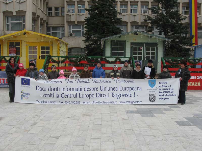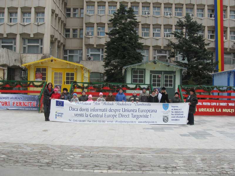 Astăzi 30 decembrie 2009, între orele 10 si 13, cei mai mici dar si cei mai fideli utilizatori ai Punctelor de informare europeana Gura Ocnitei si Raciu au fost premiati de Centrul EUROPE DIRECT TARGOVISTE in cadrul unei activtati ce s-a desfasurat in orasul lui Mos Craciun din Piata Tricolorului - Targoviste. Copiii, elevi ai scolilor de pe raza localitatilor mentionate au primit in dar carticele, agende scolare, materiale informative, DVD-uri cu filmulete si nu in ultimul rand... dulciuri. In partea a doua a programului, impreuna cu membrii echipei EUROPE DIRECT si cu doamnele bibliotecare, responsabile ale punctelor de informare mentionate, am pornit la patinoarul din centrul orasului. Iata mai jos cateva imagini.