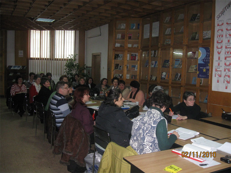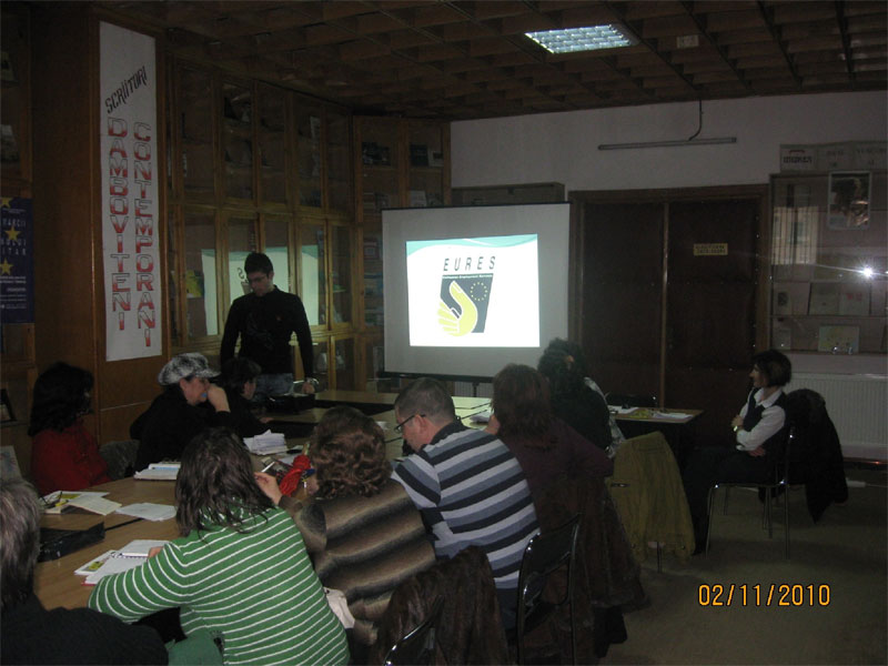 SCURT REZUMAT AL ACTIVITATII : Cu ocazia consfătuirilor profesionale ale personalului din bibliotecile publice din judeţul Dâmboviţa, echipa de proiect împreună cu elevii voluntari au prezentat pe tema „Primul dumneavoastră loc de muncă în străinătate”. Au fost distribuite materiale informative de prezentare a centrului şi un calendar pentru anul 2010.